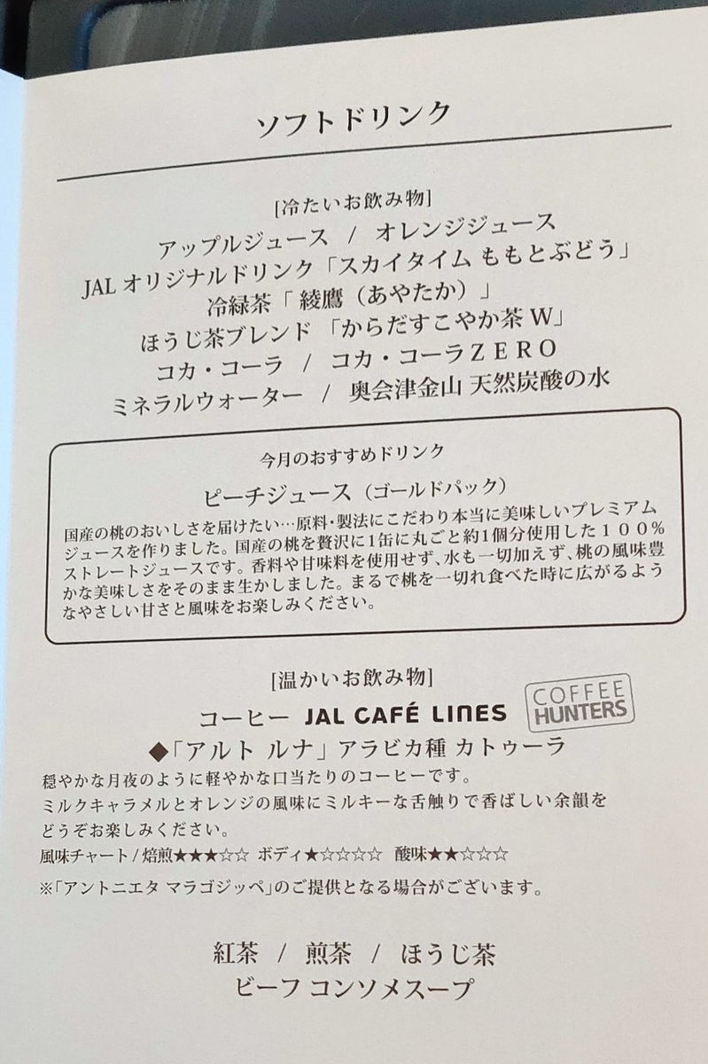 3.シートベルトサインが消えた後、先ほどの担当CAさんより、食事のメニューの説明と、飲み物の確認をされました。
