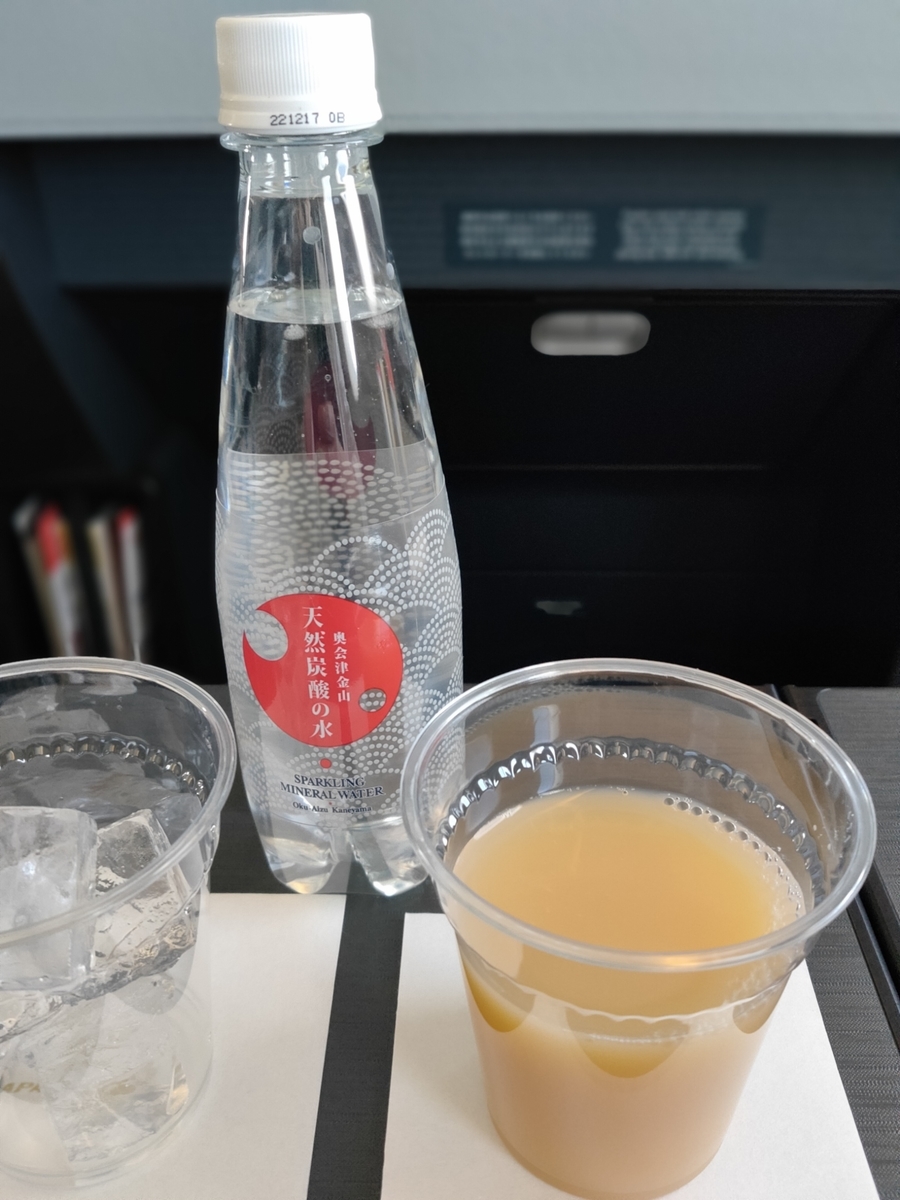 11.先ほどのCAさんがピーチジュースと炭酸水を持ってきてくださいました。