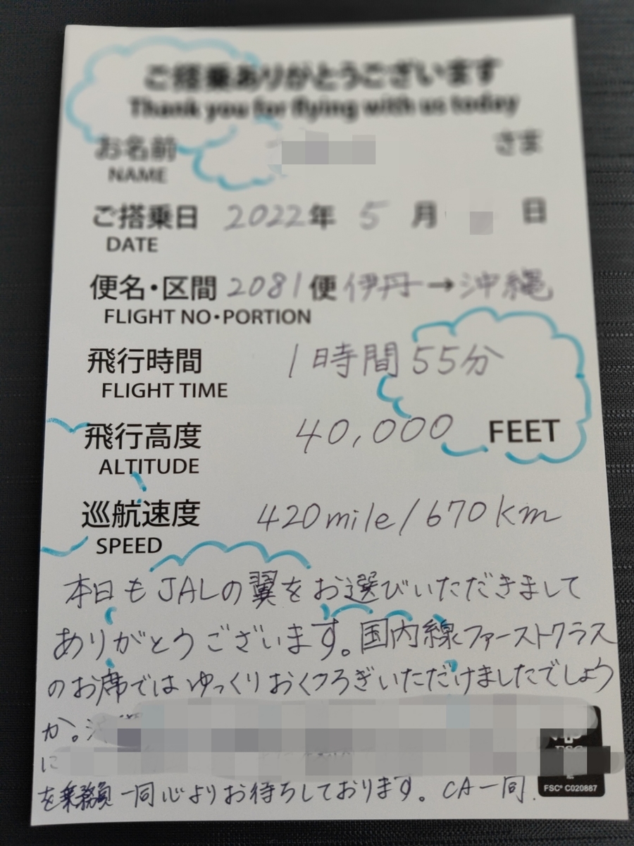 そして、帰り便もCAさんの各サービスが終わったころに、なんと、またまたメッセージカードを頂きました!!。