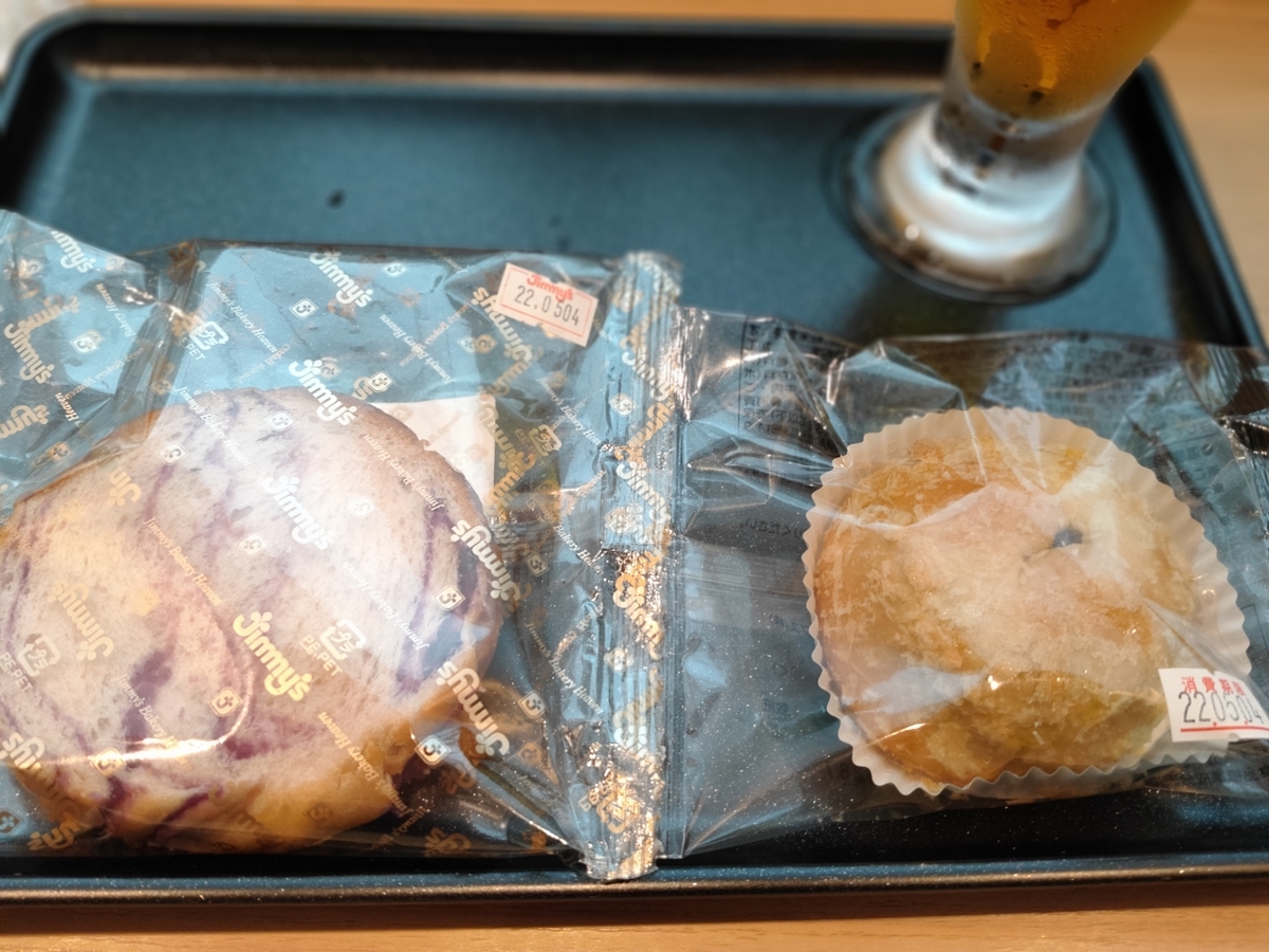 機内食、白ワイン(ミニボトル)、森伊蔵濃い目の水割り、おつまみ2種、ピーチジュース、炭酸水(カップ・氷付き)